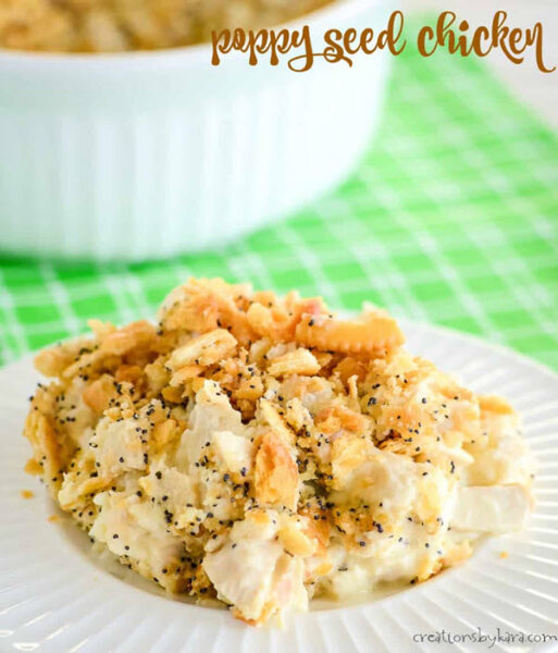 We absolutely love this recipe idea for poppy seed chicken, which really takes things to a whole new level with juicy chicken, creamy sauce, and rice topped with poppy seeds and buttery crackers.
