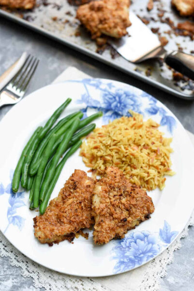 Another delicious oven-fried chicken recipe features crispy onion chicken made with a savory coating of crunchy French-friend onions!