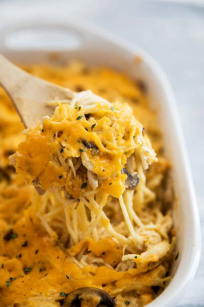 Best of all, you don’t have to boil the noodles or pre-cook the chicken. You can just bake it all in your casserole dish in about an hour.