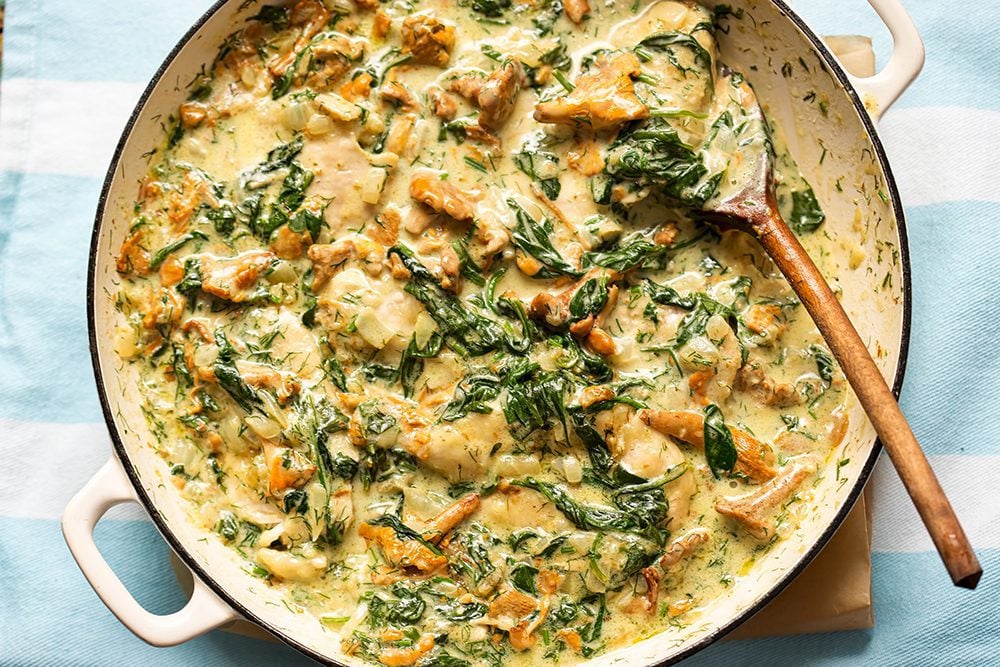 What is a healthy alternative to cream in spinach and mushroom chicken?