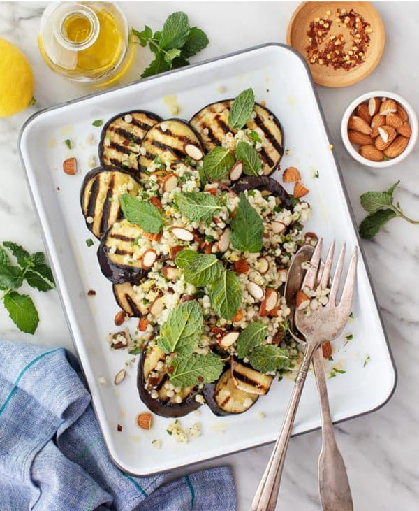 If you make the couscous salad topping in the recipe, you can enjoy this grilled eggplant as the main dish. The almonds, apricots, Medjool dates, and couscous makes this a hearty meal.