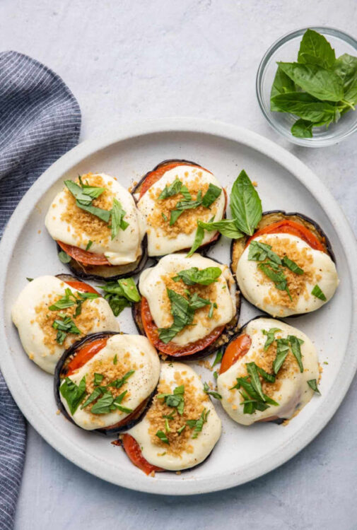 This lightened-up version of sliced eggplant parmesan is great for low carb diet options, and the tomatoes give this recipe so much flavor.