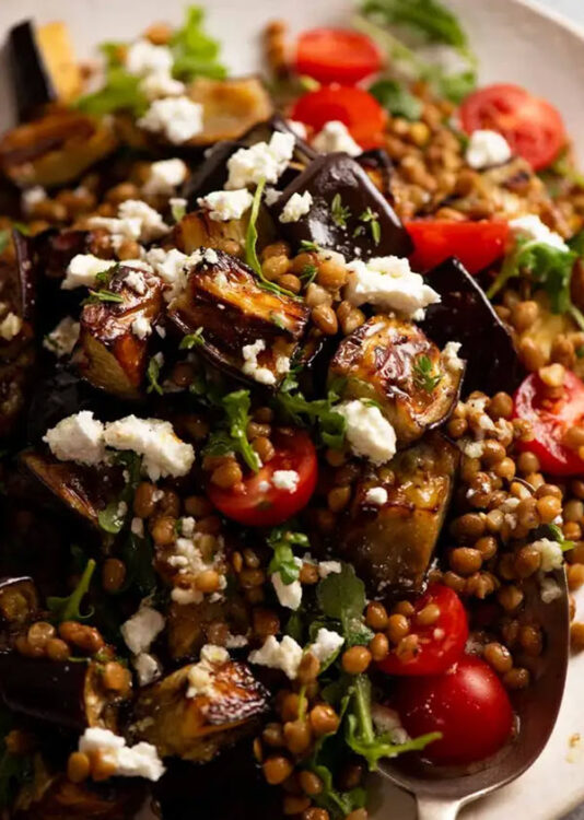 The lentils and roasted eggplant are tossed in a tangy lemon garlic dressing.
