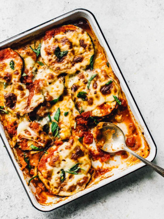 Also, this recipe doesn’t use the traditional breading that comes with classic eggplant parmesan.