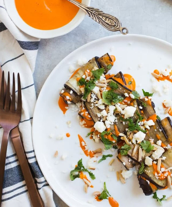 The eggplant involtini is made with eggplant, coconut oil, crumbled feta cheese, sea salt, black pepper, and chopped cilantro for a tasty garnish.