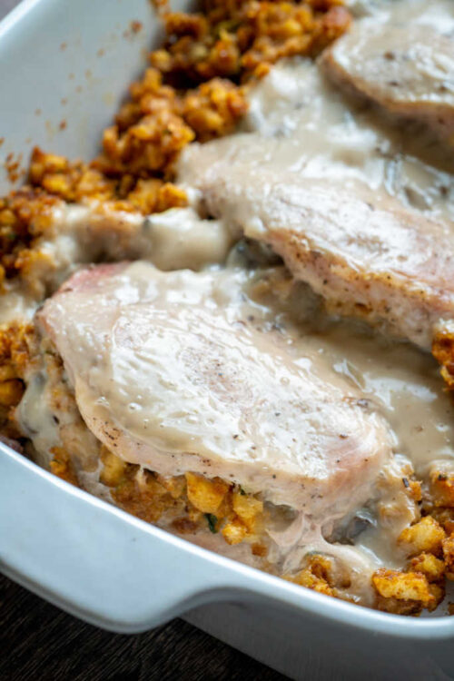 You’ll want to open up the porkchops before cooking so you can stuff them with stovetop stuffing. You’ll pour over some creme of mushroom soup and then salt and pepper to your taste preference.