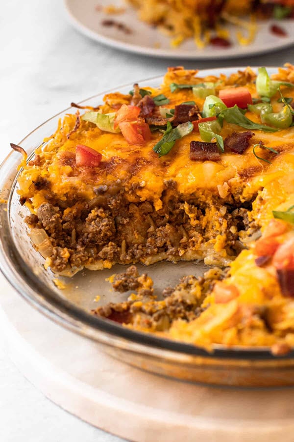 You make this with shredded potato pie crust, layers of seasoned ground beef, cheddar cheese, and a few other ingredients.
