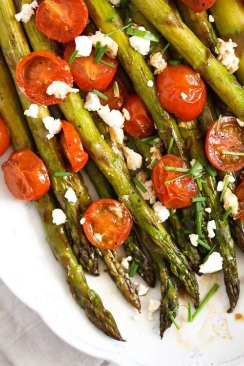 You want to roast your asparagus and tomatoes in the oven for about 15-20 minutes before serving them up because that brings out all of those great flavors even more.