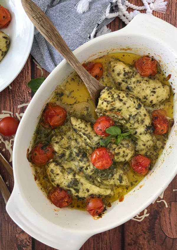 Even better, this pesto chicken tenders dinner takes just five minutes of prep time before you stick it in the oven.