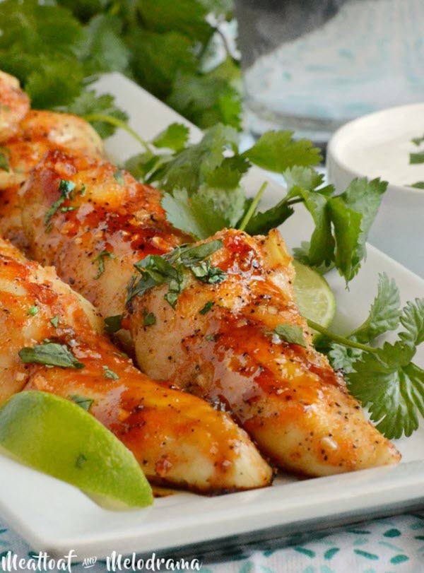 The glaze for this chicken strip recipe is made with sriracha sauce and honey, so there is a delightful contrast between spicy and sweet.