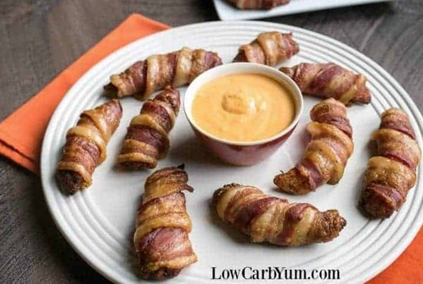 This recipe for bacon wrapped chicken tenders are also keto chicken tenders. The chicken tenders have no breading and you can use whatever type of dipping sauce you like.