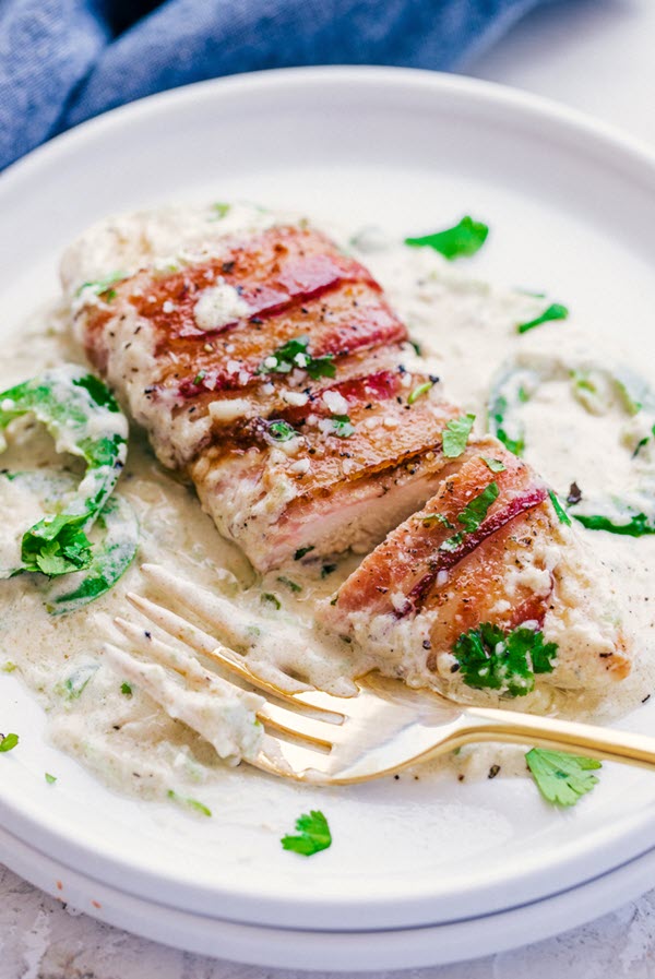 You can make this creamy garlic pasta recipe with chicken breasts, chicken strips, or chicken tenders.