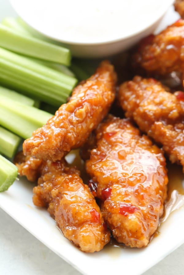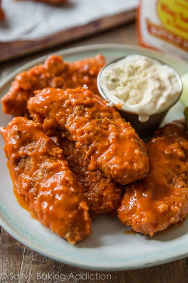 These buffalo chicken tenders are baked, so they have a lot less fat than traditional fried buffalo wings.