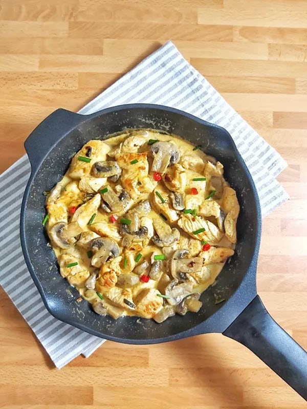 The mushroom cream sauce is full of delicious ingredients such as heavy cream, garlic cloves, fresh lemon thyme, chili pepper, nutmeg, butter, extra virgin olive oil, nutmeg, and chives.