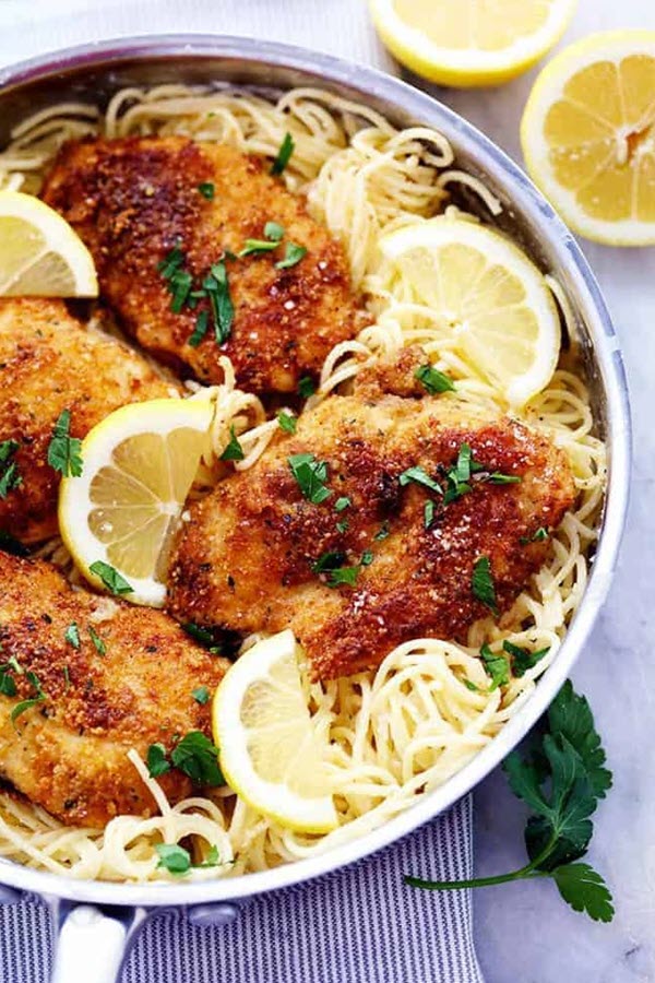 This creamy garlic and lemon sauce is so creamy on the pasta, and the contrast of the crispy chicken tenders is absolutely perfect.
