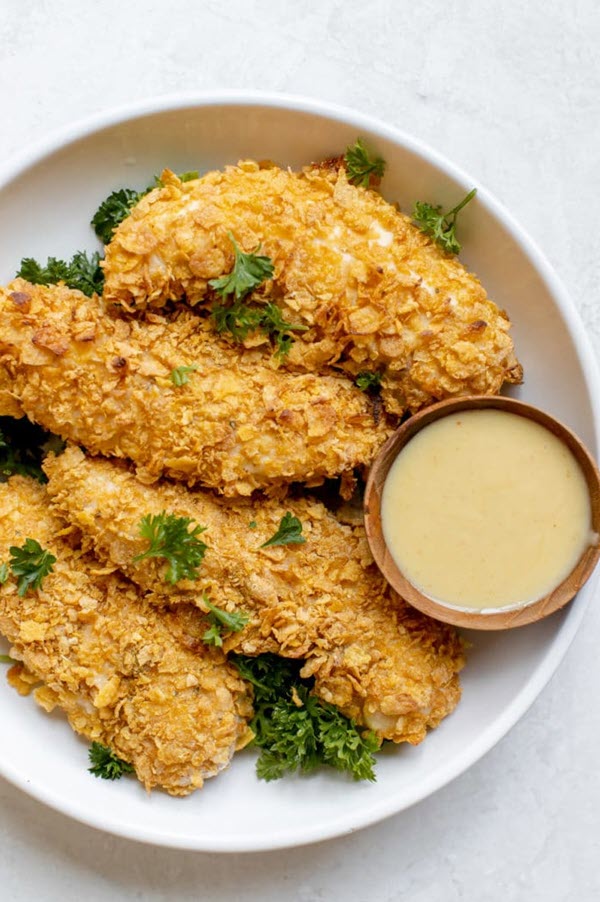 Similar to how crushed Doritos add tons of flavor to your chicken tender meals, crushed cornflakes cereal can do the exact same thing.