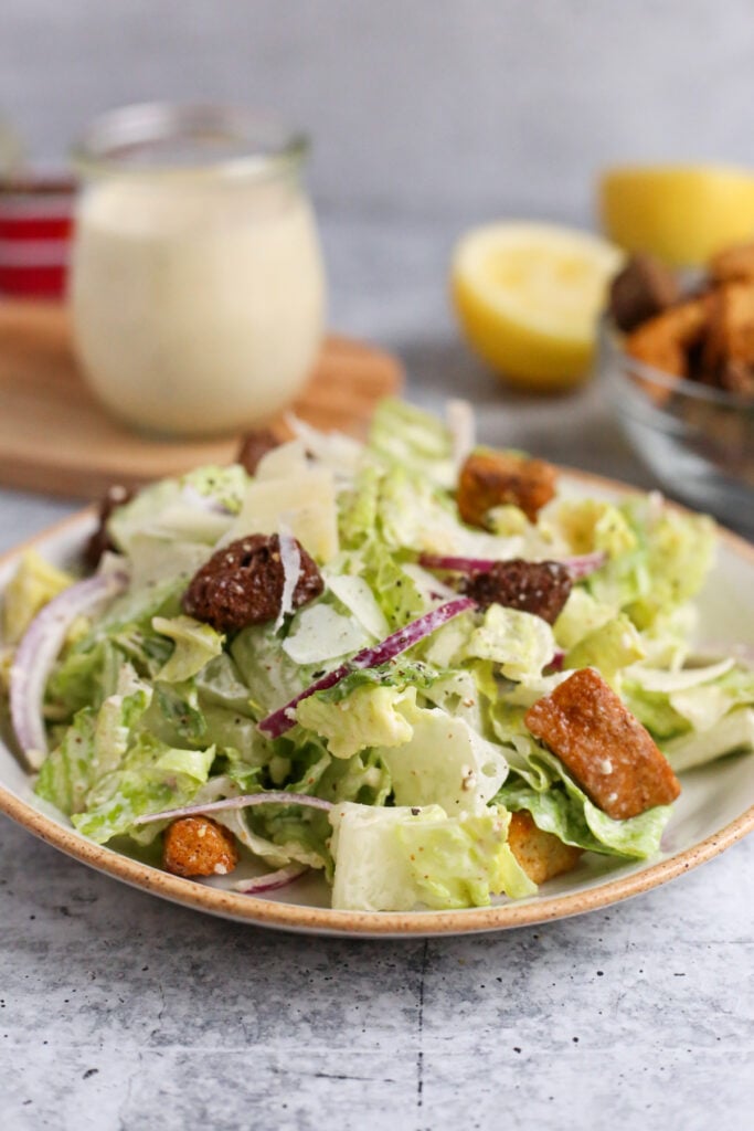 Caesar salad starts with crisp romaine lettuce and fresh homemade dressing. You need garlic, anchovies, lemon juice, and parmesan cheese for the best flavor.